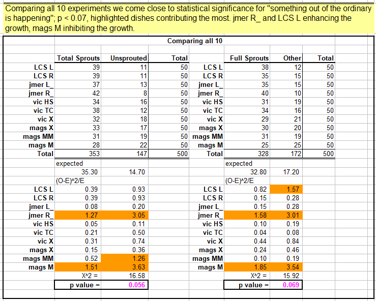 Broccoli Seed Experiments, Round #3The purpose of the experiments is to see if the sprouting and growth of broccoli seeds can be influenced using energy healing methods such as The Bengston Method. The experiments were inspired by Kayna who posted her broccoli seeds experiments on BengstonReseach.com and asked if someone could replicate them.Round #3 consists of 4 experiments that ran concurrently: 2 remote experiments (LCS and jmer) and 2 local experiments (vic and mags). This webpage will consist of Lab Setting: Explanation and initial setup of each experiment![]() From left to right, at top: jmer's L, R, LCS's L, R, (with water jars beneath them), vic's, a commercially available homoeopathic solution (HS) (decoy of product beneath them), cotton treated (TC), untreated control (X), with bottle filled with tap water to be used as a common source. Bottom left to right: magnets (mags), untreated control (X), refrigerator magnet (M), neodymium magnet (MM). Pictures of the dishes were taken daily and posted on a website so that the remote influencers could monitor progress. PDF's, similar to the reports in the links below, were also updated periodially with pictures so that the remote influencers could compare day to day changes. LeastComicStanding - Remote Water Treatment (LCS)Initial Setup![]() There will be 2 dishes with 50 seeds each marked L and R for left and right, 2 separate jars of water marked L and R, and 2 small plastic cups marked L and R used to gently top off the water. The remote influencer, LeastComicStanding (Reddit username), will get pictures (similar to above, but individual images) of the jars of water (water originally from the same source) and choose 1 to treat remotely. As the experimenter vicsmyth (Reddit username) will be blinded as to the choice. vicsmyth's only intention will be that the experiment is a success, showing a statistically significant difference. LeastComicStanding was able to treat the water with any modality of choice, any intention of choice, any frequency of choice and start treating it anytime prior to the start of the experiment, Tuesday, Feb 20th, 12pm Chicago Time (GMT-6). jmerdsoy - Remote Treatment of Entire Dish (jmer)Initial Setup![]() There will be 2 dishes with 50 seeds each marked L and R for left and right, both will be watered from the same source. The remote influencer, jmerdsoy (Reddit username), will get pictures (similar to above, but individual images) of the 2 dishes and treat 1 entire dish rather than just the water. As the experimenter vicsmyth (Reddit username) will be blinded as to the choice. vicsmyth's only intention will be that the experiment is a success, showing a statistically significant difference. Similar to LeastComicStanding, jmerdsoy was able to treat the dish with any modality of choice, any intention of choice, any frequency of choice. A week prior to the experiment starting, the picture of the dishes only had the seeds in it. Once the water was added the water on Feb 20th, vicsmyth posted picture os the individual dishes with water for jmerdsoy to download and treat. vicsmyth - Local Treatment of Cotton and Homeopathic Solution (vic)![]() There will be 3 dishes with 50 seeds each. vicsmyth is going to treat some cotton (using his patent pending cotton angel) and have the treated dish (T) sit on the cotton angel. A commercially available homeopathic solution (HS) will be added to the water in the dish marked (M), 1 dose daily. The cotton angel will be treated multiple times a week, if not daily. The unmarked control (X) will be untreated. All 3 dishes were filled and topped off with untreated water from the same container, from the same source, the same water as will be used in jmer's experiment. The photo of HS is a decoy of the actual product, as vicsmyth did not ask the manufacturer permission to use the product name. vicsmyth - Refrigerator magnet vs neodymium magnet (mags)Initial Setup![]() The magnet that vicsmyth used in the previous experiment was a cheap refrigerator magnet from the dollar store which has a magnetic field rated at 10-50 gauss, earth's magnetic field is 0.5 gauss. vicsmyth just purchased a really strong neodymium, rare-earth magnet that's rated at 1,000 gauss. So the experiment had an untreated control (X) comparing it to a refrigerator magnet (M) and the neodymium magnet (MM). All 3 dishes were filled and topped off with untreated water from the same container, from the same source, the same water as will be used in jmer's experiment. General Discussion of Results: Initial expectations and outcomes.For the two remote experiments, LCS and jmer, the theory was that two of the dishes would be similar to each other and the 2 known controls from vic and mags. So the two treated dishes would stand out statistically. That, however, was not the case as, out of the entire group, LCS's dishes and jmer's dishes showed the most enhanced growth that was statistically significant!vic's experiment was an attempt to replicate previous experiments where vicsmyth treated a dish with water, plus a dish with the commercially available homeopathic solution (HS) was added. In previous experiments where vicsmyth treated either the entire dish or the water, and in an experiment with pinto beans, the treated dishes showed inhibited growth compared controls. The theory was that this trend would continue. However, that was not the case as vic's treated dish showed enhanced growth compared to the control. HS did not show a promising result. The experiment with the magnets looked promising at the outset, MM showing enhanced growth. However, by the end they seemed to have evened out. A previous experiment using a refrigerator magnet inhibited the growth. In this experiment the weaker refrigerator magnet again inhibited the growth. ![]() Links to PDF documents of each experiment with photos and statisticsLeastComicStanding - Remote Water Treatment (LCS)PDF report complete with photos and statistics and details (L